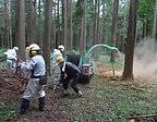 【写真】6月1日、おぐらの森、チッパー作業の様子。騒音と粉塵の舞う中での作業は大変だが、すっきりした森を見ると気持ちがいい。